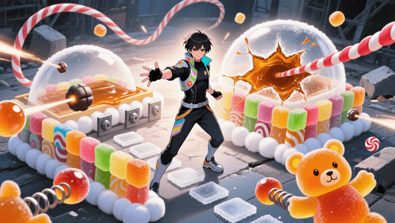 Projectile control: Firing hard candy bullets, peppermints like shuriken, jawbreakers like cannonballs, or splintering sugar shards for shrapnel effects.