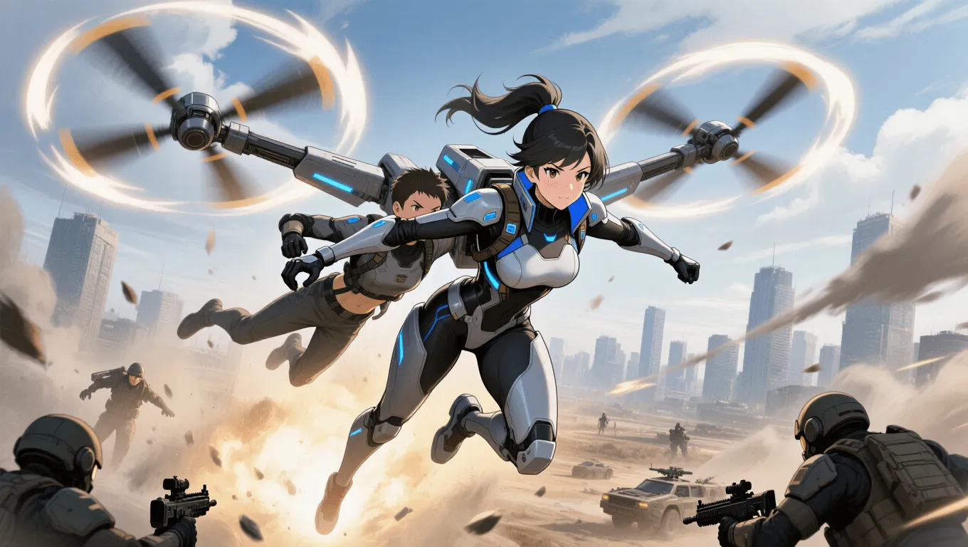 Tech-based heroes and villains who wear rotor rigs, drone harnesses, or mechanical backpacks that spin like compact helicopter assemblies.